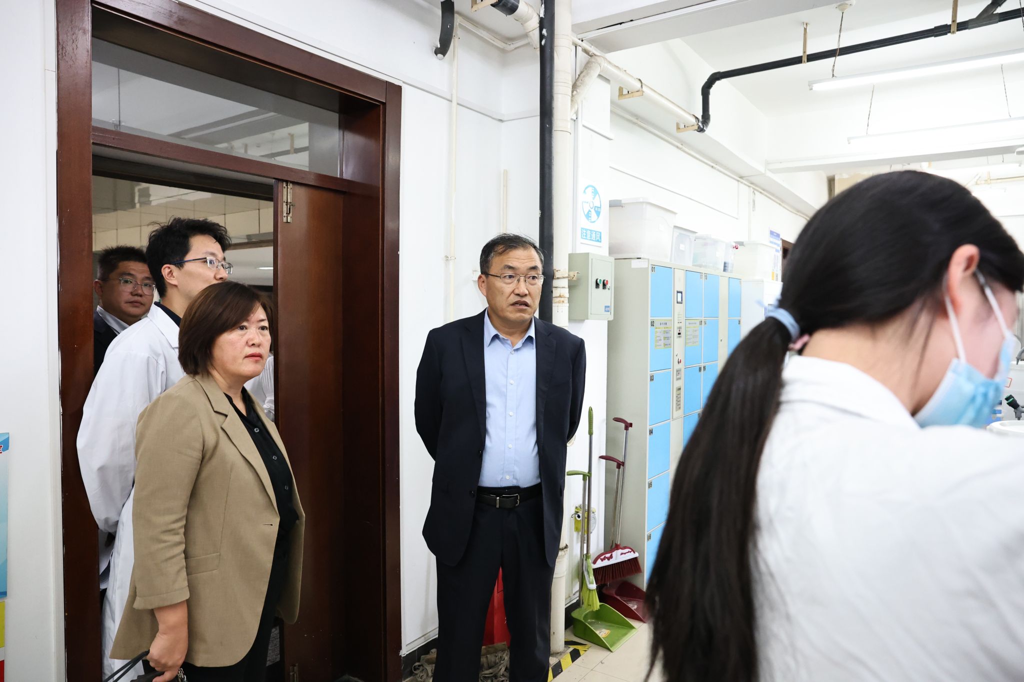 下午14:00时,张明耀书记在药化学院党委董春欣书记、张钰院长、郑典亮副书记、杨艳艳副院长、金刚副院长的陪同下查看了药化学院位于化学化工楼的教学、科研实验室,并与实验室的师生进行了交流,了解教学科研工作的开展情况,存在哪些急难愁盼问题等。